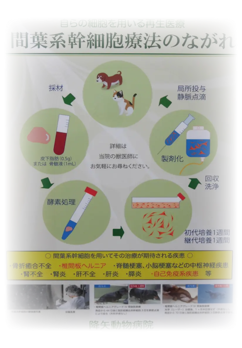 治療効果には差がありますが、主に使用するケースとしては脊髄損傷(推間板ヘルニア)骨折癒合不全、炎症性関節炎、膵炎、自己免疫性疾患、など様々な状況での効果に期待があります。